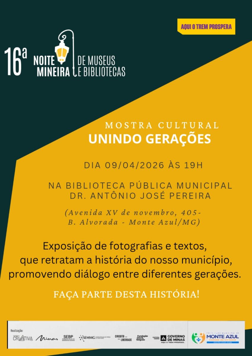 Dia 09 de abril, às 19h, tem a Mostra Cultural “Unindo Gerações” na Biblioteca Pública Municipal Dr. Antônio José Pereira 📍